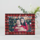 Modern Minimalist Family God jul Photo Helgdag Card, Features elegant calligraphy script font God jul, snöflingor och red buffalo plaid bakgrund. Lägg till ditt personliga meddelande för foto, familj namn och anpassningsbar.