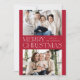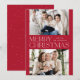 Modern julfotokort med "God jul" som visas i mitten av designen i trendiget med vit text med röd bakgrund. Anpassa det enkla julkortet med dina foton från familjen namn och två vågräna. Kortet återgår till visningen med en röd bakgrund med subtila vita punkter (snö).