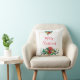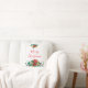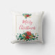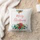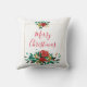 En kudde med söt blommigt bouquet i rött, guld och grönt färg. En guld ram bakom blommorna. God jul skrivet inuti.