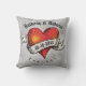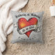 Den här kudden har en färgad av atueringshjärtat i stil med en orange och röd fraktalutformning. Hjärtat är försett med en banderoll. Det finns två namn ovanför och ett datum på banderollen som du kan anpassa dig till. Texten nedan lyder "För alltid". Baksidan av kudden har en monogramstart.