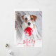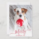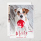 Elegant Modern White and Red Script 2 Photo Merry Script-julkort. Den här snygga, enkla, minimalistiska, nyktra mallen för Julhälsningar kort innehåller texten "Merry" hälsning, som är skriven i ett vackert handskrivet rotografiskt skript i svan i rött på vit färg-bakgrund. På motsatt sida med din hälsning-meddelandemall med en liten hjärtdocka på vitt och en fotomall. Söt hälsningskort för din familj och dina vänner under julens Julhelg.