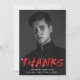 Snyggt, det moderna studenten-tacket som du har med dig lodrät student med "Tack" i röd skrift med vita färgstänk. Anpassa kreativets framsida genom att lägga till student, namn, namn och studenten. Baksidan av fototacket i studenten har du plats för ett skrivet eller handskrivet tack och ett rött och vitt färgstänk.