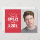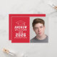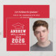 Meddela din högskola eller högskola student i stil med detta tillkännagivande och denna partiinbjudan från studenten. Dubbelsidiga kort har en hög porträtt i student med gradsockel och enkel och modern vit typografi. Röd bakgrund kan ändras till ett annat färg med funktionen "Anpassa den" och sedan Redigera / Bakgrund om du vill markera ett annat färg.