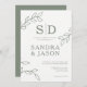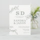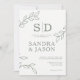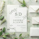 Modern konsthandling Bold och modern bröllopsinbjudan med tre bladverk teckning och vissa monogram på benvit bakgrund. Par monogram visas också på baksidan av inbjudan på en sidbakgrund.