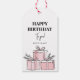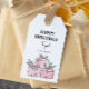 Den här presentens märkre har en charmerande, minimalistisk utformning med en ljus, texturerad bakgrund som liknar vattenfärgen papper. Det översta avsnittet innehåller ett fet, versalt meddelande i ett klassiskt serif-teckensnitt, medan ett mindre, känsligt skriptteckensnitt tillför en varm, handskriven känsla till hälsning. Under texten finns en illustration med tre snyggt inslagna presentlådor i mjuka rosor, som var och en är försedd med enkla knärör och blad för en snygg beröring. En röd och vit vriden sträng binds genom en hål överst och lägger till en popo av färg. Hela stil är modernt, rent och lekfullt, perfekt för en tänkbar födelsedagspresent.