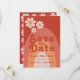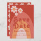 Modig inbjudan till 70-talets orange bröllop spara datum. Coolans retrominimalistiska daisy mönster med regnbåge i orange och persikor av aprikoterrorism. Med den här roligten kan du enkelt spara datumkortet genom att använda de enkla mallarna. Idealisk för tonen för sommaren vår eller hösten bröllop. Originalkonstverk av konstnären Catherine Sweetman