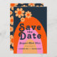 Modern retroregnbåge och enkel daisy 60:s 70:e inbjudan till stil bröllop spara datum. Ett vintage, groovy hippy stil färg-tema med marin blå rosa-orange aprikos tangerine-senap-gult. Vacksam minimalistisk daisy mönster på inbjudningens baksida och tre förenklade daisy med arch och groovy 70-talets stil-typografi. Originalkonstverk av konstnären Catherine Sweetman