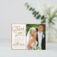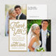 Ett icke-traditionellt tack-fotokort med modern men retro-font. Matchar Rädda Datumet och Rädda Vårt Datum med samma typsnitt, färger och utseende. Ersätt med dina foton, meddelande och namn (eller använd det medföljande exemplet). Vit bakgrund med guldbård.