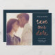Ett modernt datum för att spara det datum som innehåller avslappnad sparar datumskriptet i ro guld med par namn och datum i mörk grått på rosa-bakgrund. Perfekten att meddela ditt kommande bröllop till vänner och familj för att se till att de markerar sina kalendrar. Koordinerar med andra objekt i vår moderna Spara datumsamlingen som returetiketter, klistermärken och annat.
