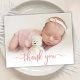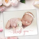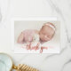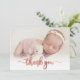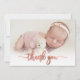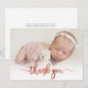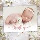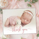 Simple Modern Elegant Calligraphy Rosa ros Guld Script Photo Newborn Baby Tack Birth Notification Card. Innehåller en vacker "tack"-text i ett handskrivet calligraphy swash svan font script i FAUX rosa ros guld-folie. Förskapat personligt meddelande på baksidan. Underbar för flicka eller pojke. Enkel att anpassa med ditt baby-foto och din information.