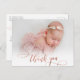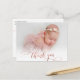 Elegant Modern Calligraphy Ro Guld Script Newborn Baby Photo Tack Postcard. Har en vacker "tack"-text i ett handskrivet calligraphy swash svan-teckensnitt i FAUX rosa ros guld-folie. På baksidan fördefinierade personliga meddelanden i svartvitt. Enkel att anpassa med ditt baby-foto och din information.