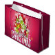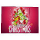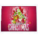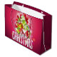Gråväska med en ljus och snygg julgrafik. I texten står det God jul. Designad med en träd-formad mound av presenter med festive snöflingor, stjärnor, jultomter och glatt tittar gnistor. Gräs träd och nål och träd illustration ingår också i denna bild av helgdag. Bakgrunden är en pulserande rödaktig rosa färg.