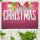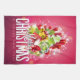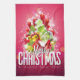 Kökshandduk med en ljus och festlig julgrafik. I texten står det God jul & Gott nytt år. Designad med en träd-formad mound av presenter med festive snöflingor, stjärnor, jultomter och glatt tittar gnistor. Gräs träd och nål och träd illustration ingår också i denna bild av helgdag. Bakgrunden är en pulserande rödaktig rosa färg.
