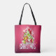 En tote-väska med en ljus och fin julgrafisk design. I texten står det God jul & Gott nytt år. Designad med en träd-formad mound av presenter med festive snöflingor, stjärnor, jultomter och glatt tittar gnistor. Gräs träd och nål och träd illustration ingår också i denna bild av helgdag. Bakgrunden är en pulserande rödaktig rosa färg.