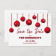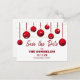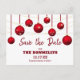 Stilfull jul, spara datumet-kort, med en vintervit bakgrund, röda julgransprydnader, sladdbelysning och en klassisk, redigerbar mall som enkelt kan anpassas.