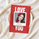 Det röda kärlekskortet med foto har en djärv röd design med ett personligt foto för en hjärtlig touch. Det är speciellt eftersom det förvandlar din kärlek till en meningsfullt minnessak som känns personlig och tidlös. Perfekt för Alla hjärtans dag eller en årsdag, för en make, maka, par, pojkvän eller flickvän