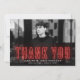 Modern examens tackkort som visar examen fotot i liggande format med "Tack" i röd neonbokstäver. Anpassa examens tackkort genom att lägga till examen namn, skolans namn och examensår. Baksidan av examens fotot tackkort visar ditt skrivna tackmeddelande eller lämna tomt för att skriva din egen. Den enfärgade röda bakgrunden kan ändras till en färg du väljer.