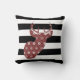 En kudde som presenterar en illustration av en röd hjorthuvudsilhouette med vitsnöflingor, planlägger. Bakgrund är svartvita randar.