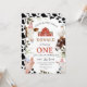 Söta pojkens djur och gård tema första födelsedagsinbjudan med några gårdsfesteriärer, festhatt, lövverk och ko tryck mönster. Denna kallar på alla festeriärer gård tema första födelsedagsinbjudan är perfekt för en festeriärer födelsedag och kan användas för alla åldrar.