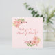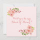 Elegant rosablommig "vill du vara min brudtjänsteflicka" -kort med buketter av pastellåsfärgade akvarellrosor, hibiskus och andra små blommor i nyanser av rosa och persika, med yppiga gröna botaniska blad. Den är placerad mot en blekrosa bakgrund.
