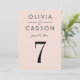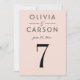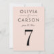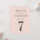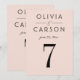 En mjuk rosa bakgrund och fet svart serif-typografi skapar ett modernt, feminint bordnummerkort för bröllop. Paret namn och bröllopsdatum visas i en ren typografisk layout för en polerad monogramdesign. Paret namn, datum och bordnummer är lätta att anpassa. Varje bordnummer måste anpassas individuellt och läggas till i varukorgen en åt gången.