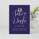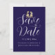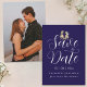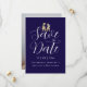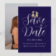 modern elegant fotobryllopskort "Spara datumet" med Whimsical dinosaur tema "Spara datumet" marinblå och vit kort Roligt T-Rex brud & brudgum bryllopsannonsering