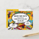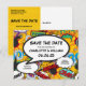 En rolig, cool och trendig retro serietidning popkonst-inspirerad spara datum inbjudan som sätter wham, zap, pow i alla bröllopsdatum annonser. Baksidan visar din ytterligare evenemangsinformation. Designad av Thisisnotme