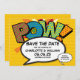En popup-inspirerad roligt, coola och trendig för tecknad bok sparar datuminbjudan som lägger gryningen, locket, pow i ditt meddelande om bröllop-datum. Den omvända har en matchande bok-polka-punkt mönster som du kan ersätta med en egen bild eller ett eget foto. Designad av Thisisnotme©