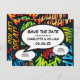 En popup-inspirerad roligt, coola och trendig för tecknad bok sparar datuminbjudan som sätter in viset att det är valfritt datum i bröllop. Den omvända har en matchande tecknad bok mönster som du kan ersätta med en egen bild eller ett eget foto. Designad av Thisisnotme©