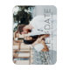 En modern magnet för att spara datum som visar ditt favoritförlovningsfoto med "Spara datum" i en enkel svart typsnitt överlagring kompletterad med elegant kalligrafi skrift. Anpassa magneten för att spara datum genom att lägga till era namn, bröllopsdatum och bröllopsplats.
