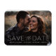 En modern bokning av datum magnet som visar ditt favorit engagemang foto med "Spara datum" i en enkel vit typsnitt överlagring kompletteras av elegant kalligrafi skrift. Anpassa fotots datum magnet genom att lägga till dina namn, bröllopsdatum och bröllopsplats.
