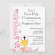 Vår snyggt blommigt First Heliga Communion Call är en modern och traditionell heliga-inbjudan. Rosa & vit inbjudan har en vacker snyggt rosa blommigt ram, med en chalice & heliga eucharist med skarp vit bakgrund. Baksidan av vår har en passande färg för en speciell beröring i extra. Modern och ny design som imponerar på din gäst. Perfektens inbjudan till en första heliga-gemenskap. Besök vår butik om du vill ha fler val i färg. ©Mujka ©Zenware Designer