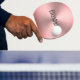 Grått visning-texten är mitt i den här rosa pingpongpaddeln. Du redigerar texten för att visa önskad namn. Utformningen av borstat metall är teckningar.