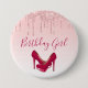 Ett modernt trendig på en födelsedagsknapp. Bakgrunden har en bild av mousserande rosa glitter droppar, längs toppen. Resten av bakgrunden är en delikat pastellfärgad övertoning vid rosa färg. Ett par högklackade stilettos lägger till en snyggt på rosan.
