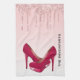 Ett modernt trendig på en kökshandduk. Bakgrunden har en bild av mousserande rosa glitter droppar, längs toppen. Resten av bakgrunden är en delikat pastellfärgad övertoning vid rosa färg. Ett par högklackade stilettos lägger till en snyggt på rosan.