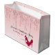 En modern, trendig design på mösspåse för sängkammarfesten. Bakgrunden har en bild av gnistrande rosa glitterdroppar längs toppen. Resten av bakgrunden är en delikat rosa pastellfärg. Ett par rosa högklackade stövelspjälor under den personliga texten.