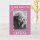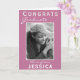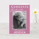 Modern Rosa Grattis Examens Foto Kort med en examen kandidates namn och ett foto. Examen kort med text Grattis, examen och examen namn på mörk rosa och foto av examen kandidaten på framsidan - anpassa med ditt namn och ditt foto. Anpassa eller radera texten i kortet. Examen mössan är på baksidan.