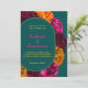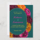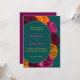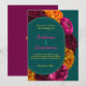 Modern gul het rosa grön blomsterbröllopsinbjudan. Gör ett djärvt och livfullt intryck med denna moderna gula, heta rosa och gröna blomsterbröllopsinbjudan, mot en slående grön turkos bakgrund. Med en livlig blandning av tropiskt inspirerade blommor i livfulla färger förenar denna design samtida elegans med lekfull charm. Den rika turkosa bakgrunden framhäver de ljusa blommorna och skapar en fräsch och stilren look som är perfekt för vår- och sommarbröllop. Med snygg typografi och en modern layout är denna inbjudan idealisk för par som vill tillföra en rolig, färgrik och sofistikerad touch till sitt bröllop.