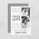 Modern rosa och det ultimata grått 2-fotot Spara datum meddelande. Datumet visas i rosa och grått-typografi i en spalt och två foton av paret. Uttrycket "Spara datumet" finns i skript stil typografi i grått. Baksidan är av fast grått färg.