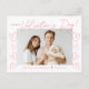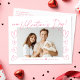 Dagkortet "Glad Alla hjärtans dag" i ett trendig rosa skript med handdragna hjärtan längs kortsidorna på vit bakgrund. Vågräts foto visas nära mitten i designen. Anpassa Valentindagens vykort genom att lägga till ditt namn och året i rosa. vykortet återgår till visning av din returadress och ditt personliga meddelande.