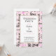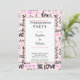 Vi presenterar vår moderna förlovningsinbjudan som är perfekt för par som söker något roligt och lekfullt! Denna inbjudan är designad för att se ut som en bildram, med en livfull rosa kant som omedelbart fångar uppmärksamheten. Ordet "Kärlek" är skrivet i en mängd olika svarta teckensnitt och är prytt med söta rosa hjärtan. Denna lekfulla design sätter tonen för en rolig och spännande förlovningsfest!
