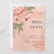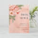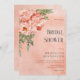 Denna bröllopsinbjudan har en stor hörnblomma med rosabruna och korallfärgade blommor kompletterade med grönska. Designen visas på en gammal, sprucken persikofärgad bakgrund. Skapad av Simply Farmhouse Press.