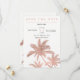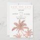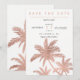 Modern enkel falsk roséguld palmer med enkel typografi, ett trendigt och tropiskt tema för spara datum för bröllop på palmer.