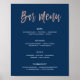 LEAH • Denna marinblå och roséguld bar meny skylt är perfekt för romantiska och eleganta bröllop. Passionen kommer från den söta handskrivna skrivstilens font i “falsk” roséguld folie struktur medan den stilrena marinblå bakgrunden i kombination med den vita kopian texten ger en touch av värdefullhet. Denna samling koordinerar bra med glamourösa firanden, särskilt för inomhus, höst eller vinter evenemang.