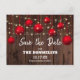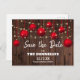 Rustic christmas, spara datum meddelande-kort, med baksida av trä, röda bubblor, sträng ljus och en klassisk, redigerbar mall som är lätt personlig.