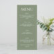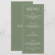 Modern and simple wedding menu in sage green. Clean and easy-to-read design that matches a minimalist modern wedding theme. Includes course description - starter, main course, desert and drinks information which is easy to edit and personalize.