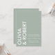 En enkel modern bröllopsinbjudan med fet typografi namn, sage grönt färg och minimalistisk design.