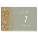 Det moderna bordsnumret bröllop i elegantens lämnat kant har en guld faux-utformning från glitter. Anpassadet kombinerar elfenbenshandskrift, tryckplåt och kursivt typsnitt mot bakgrund av en grönt.