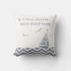 Contemporaryns segeldesign har ett grått- och vit färg-system. Vatten är en grått och vit chevron zigzag mönster och segelbåten har en modern konst mönster i segelerna. Det finns tre fiskmås som flyger över. Typografin läser Välkommen ombord på DITT BOAT NAMN, som du anpassar med knappen på högerna. Baksidan av kudden är grått och vit chevron mönster så att du kan byta om den. En roligt dekorativ kudde för att klä ut er båt eller ert strandhem.
