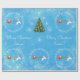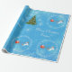 Elegant och söt personlig julomslutning papper med tomten i sin sömn dragen av en enhörn med gyllene och röda glitter i mane och svan, olika snöflingor och Julafton träd dekorerade med silver baubles. Perfekt för små barn, särskilt små flickor som gillar unicorns. Med hälsning "God jul / Emma!" i kursivt skript / kalligrafi. Se till att du anpassar namn. På blå bakgrund.